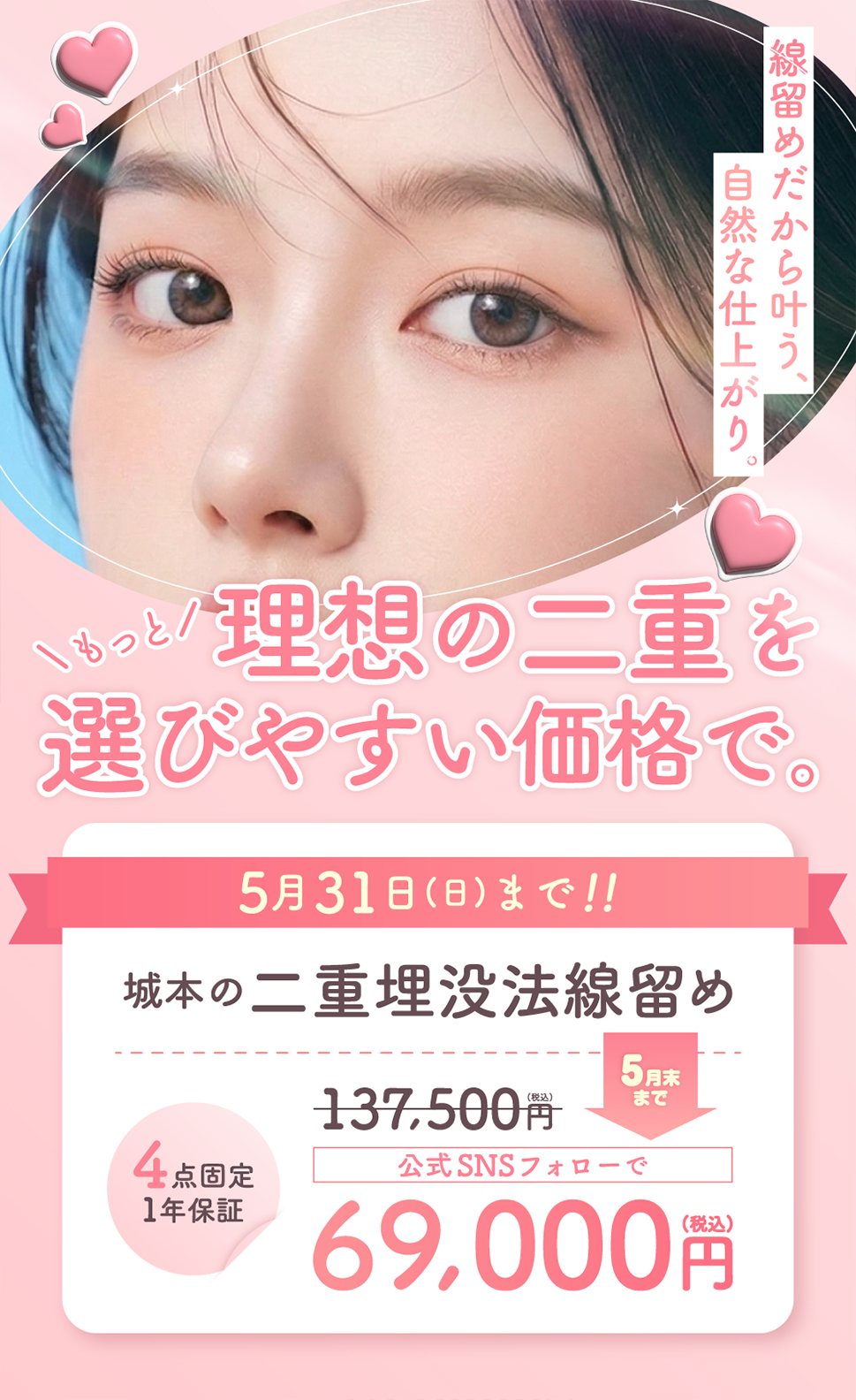 実際どのような状態であるかは診察のもとに診断を下し、治療の必要があるかを判断いたします。気になる症状があれば、まずはクリニックにご連絡ください。術後のアフターフォローもしっかり行っていくことが、城本クリニックの埋没法の特徴の一つです。